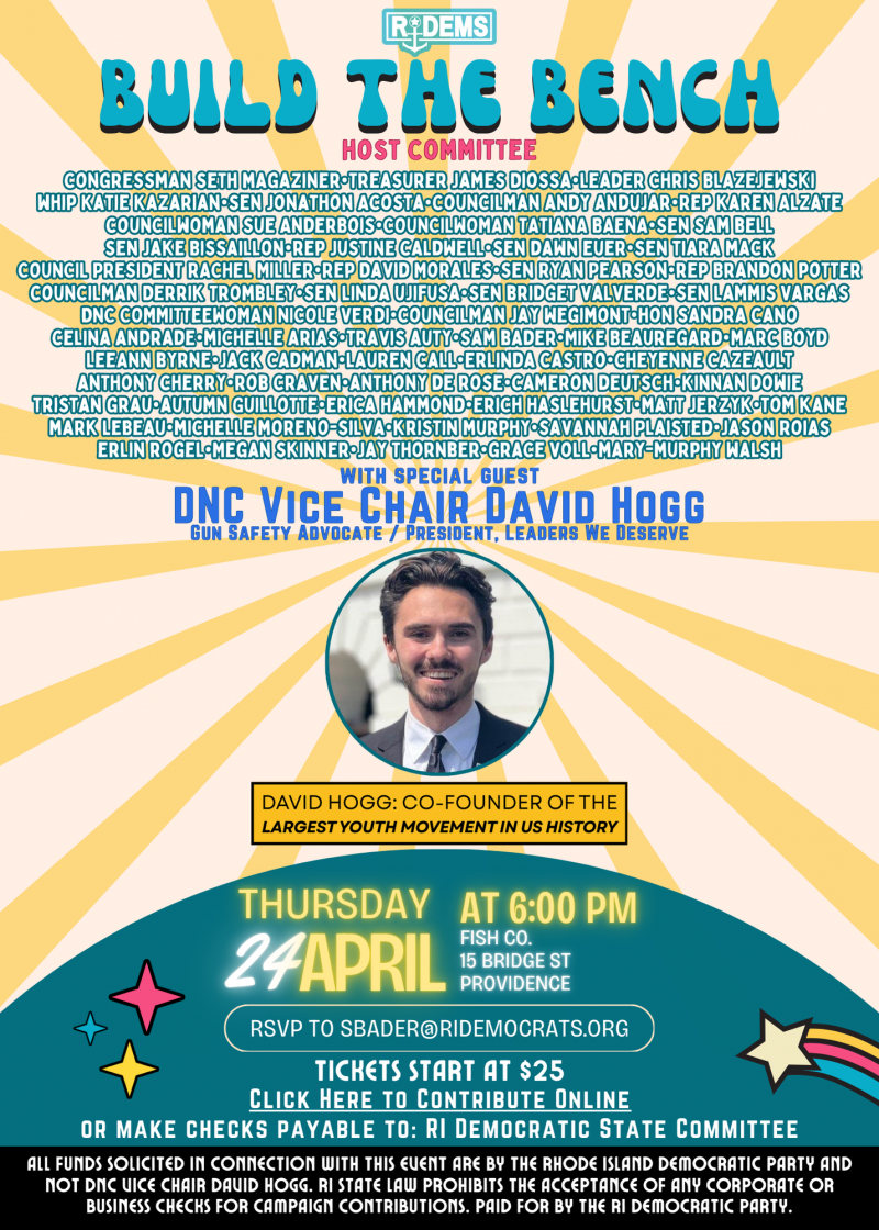 Join us on Thursday, April 24th for our Build the Bench event. We are celebrating the next generation of Rhode Island Democrats, with extra special guest, David Hogg!
